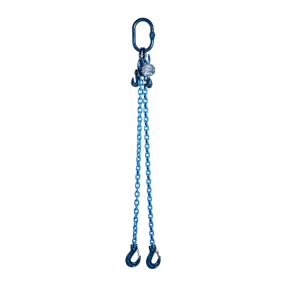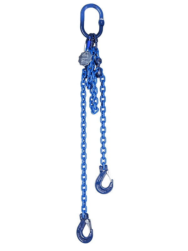Dvoupramenný řetězový vazák je sestaven: Závěsná hlava s nosností 2,1 T (110 x 60 mm), Connex, Vysokopevnostní lakovaná řetěz 6 mm modré barvy, Hák řetězový s čepem a kovanou pojistkou 2 x, Zkracovací hák 2 x, Identifikační štítek, Certifikát