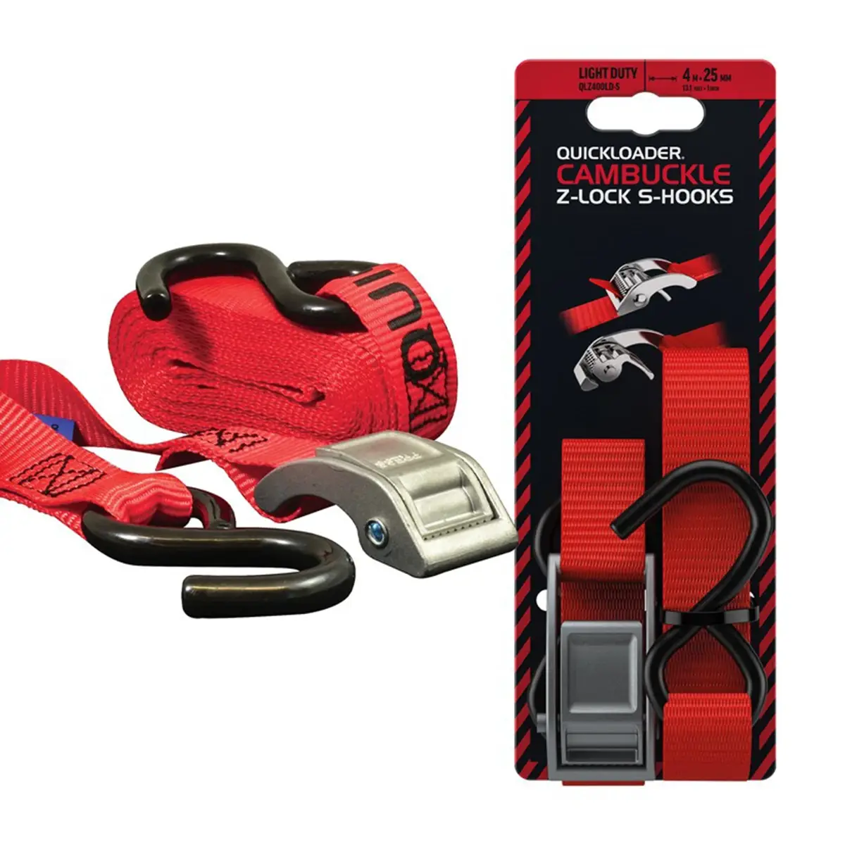 Zajištění nákladu nebylo nikdy jednodušší ani spolehlivější. Quickloader Cambuckle Z-lock S-Hooks je vysoce kvalitní upínací popruh určený pro rychlé, pevné a bezpečné zajištění různých druhů nákladu. Díky praktické Z-lock přezce typu Cambuckle a ocelovým S-hákům s ochranným povrchem umožňuje snadné, rychlé a bezpečné uchycení k jakémukoli kotevnímu bodu.