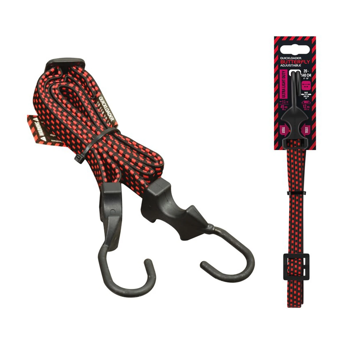 Díky svému motýlímu (Butterfly) designu a plochému profilu nabízí Quickloader Bungee Butterfly rovnoměrné rozložení síly, což snižuje tlak na povrch upevňovaného předmětu a zvyšuje stabilitu při přepravě. Skvěle se hodí pro použití v autě, dílně, domácnosti, zahradě, skladu nebo při outdoorových aktivitách.